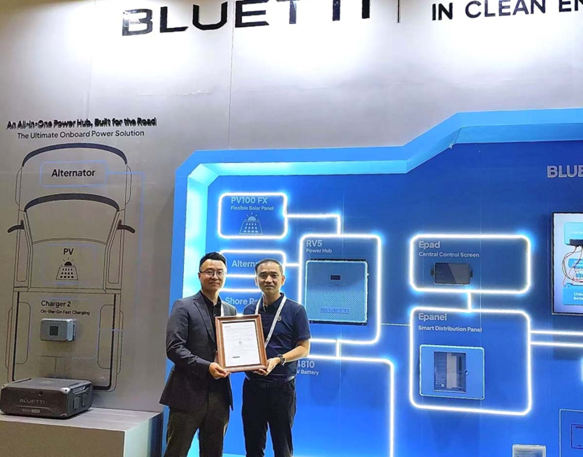 Sean Wang, Head of North America Business at BLUETTI (left) and Mr. Jackey Xie, Deputy General Manager, Electrical of Intertek China (right) witnessed the certification ceremony